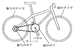 この自転車のタイヤの半径は25cmであり、後ろのギアが回転した分だけ後ろのタイヤ