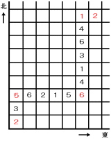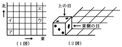 まず自分の好きなように1図のアにさいころを置きます。そしてさいころの上の目が奇 数ならば目の数だけ東へ,偶数ならば目の数だけ北へころがしていきます。(さいころは 向かい合う面の数の和が7になっています)