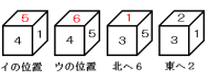これを合うのは,アに次の図のように置かれたときです。東側の目は3です。