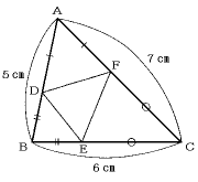 AB,BC,CAの長さが,それぞれ5cm,6cm,7cmの三角形ABCがあります。 AB,BC,CAの各辺上に,点D,E,FをADとAF,BDとBE,CEとCFの長 さがそれぞれ等しくなるように,図のようにとります(同じ印は,長さが等しいことを表 します)