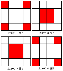 前の2つの設問の図から考えると,赤色の正方形の位置は上から1段ごとに内側に入 っていき,真ん中にきた後それまでと逆に外側に出て行くことがわかります。