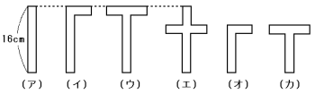 図3のように折り,斜線の部分を切り取って広げたときの図を(ア)から(カ)の中から