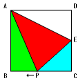 点Pが辺CB上を動くとき、三角形APEは台形ABCEから2つの三角形ABPと ECPを除いたものとして考えられます。この間は面積が一定の割合で増え続け、最 大になるのは点Pが頂点Bに来るときです。