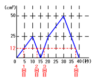 2度目は10〜15秒後の間です。 25÷(15−10)=毎秒5cm2の割合で減るので、 10+(25−12)÷5=12.6秒後