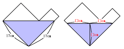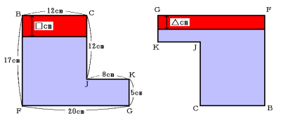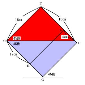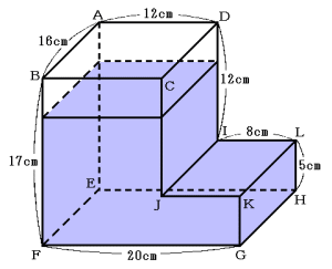 <問題> 次図のように色のついた部分まで水の入った立体を水平な床の上に置きます。この立体 を面EFGHを底面として置くと水面までの高さは,この立体を逆さにして面ABCDを 底面として置いたときの水面までの高さより2cm低くなります。 ![]() (1) 面EFGHを底面として置いたときの水面までの高さを求めなさい。 (2) 面EFGHを底面として置き,面ABCDを取り外しました。 FGを床につけたまま,側面BFGKJCが床と45°となるように傾けたとき,流れ 出た水の量は何cm3ですか。 (3) (2) の後,再び面EFGHを底面として置き,今度はEFを床につけたまま,側面A BFEが床と45°となるように傾けました。このときの床から水面までの高さを求め なさい。 <解答> *容器の頂点だけを下につけて傾けた場合ではないので、手前から見える部分を底面とし て考えて解きます。 (1) 容器で水の入っていない部分を考えます。 面BFGKJC側から見た、次の2つの図の奥行きは等しくなります。 ![]() 左の図の赤い長方形の面積と右の図の赤い長方形の面積は等しいので、 □:△= □と△の差が水面の高さの差なので、 □=2cm÷(5−3)×5=5cm 水面の高さは、 17cm−5cm=12cm 答 12cm (2) こちらも容器で水の入っていない部分を考えます。 45度だけ傾けた場合には、面KGHL側から見た図は次の図のようになります。 ![]() 手前にできる水が入っていない部分の三角柱の体積は、 (4×4× 奥にできる直方体で水が入っていない部分の三角柱の体積は、 (16×16× もともと水が入っていなかった部分の体積は、 16×12×5=960cm3 よって、流れ出た体積は、 (64+1536)−960=640cm3 答 640cm3 (3) こちらは容器で水の入っている部分を考えます。 水が入っている水の量は、 16×12×12+16×20×5−(64+1536) =2304+1600−1600 =2304cm3 よって面BFGKJC側から見た図で、水が入っている部分の面積は、 2304÷15=144cm2 まず図形が完全な直角二等辺三角形なると考えます。 ![]() 左の図のようになる場合が最大で、その面積は、 17×17× これより小さいので、右の図のように深さを□cmとして計算できます。 (□×2)×□× □×□=144 □=12 答 12cm |