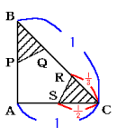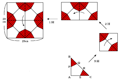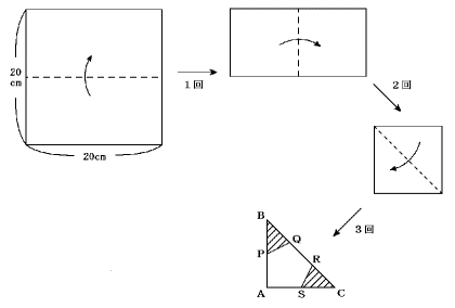 <問題> 1辺の長さが20cmの正方形の紙を下の図のように3回折った後,PQとSR切り取り ました。その後,もとのように広げたとき紙の面積は何cm3ですか。ただし,P,Sはそ れぞれAB,ACのまん中の点,Q,RhaBCを3等分した点です。 ![]() <解答> 元に戻した時の形を考える場合には、折り目に関して対称であることに注目して逆に戻 しながら考えていきます。 ![]() この問題では面積を考えるのでもっと簡単です。 最後にできた直角二等辺三角形はどの場所でも紙が8枚重なっているので、正方形の紙 は元は戻すと、上の図のように8個の直角二等辺三角形に分けるよう折り目が付いてい ます。 そのため、それぞれの直角二等辺三角形で切り落とされた部分とそうでない部分の面積 の比は、正方形で切り落とされた部分とそうでない部分の面積の比と同じになります。 ![]() 最後の直角二等辺三角形で、切り落とされた部分の割合は、 よって、広げたときの紙の面積は、 20×20×(1− 答 266 |