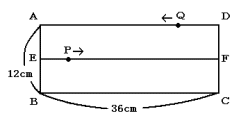次の図のような長方形ABCDがあります。点E,Fはそれぞれ辺AB,DCのまん中の点で,点Pは,EF上を点EからFまで毎秒3cmの速さ,点Qは辺DA上を点DからAまで毎秒4cmの速さで動きます。点P,Qが同時に出発するとして,次の(1)〜(2)の問いに答えなさい。