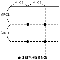・苗の株は,となりの株とおよそ20cmずつはなして,次の図のように植える。