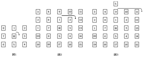 A2回目は,図2のように,@でならべたカードのまわりを囲むように,1のカードの上から,9から4までの順にカードを16枚ならべる。
