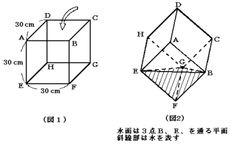 下の(図1)のように,1辺が30cmの立方体の容器があります。この容器に毎秒100cm3の割合で水を入れていき,途中で水を止めて容器を傾けたところ水はこぽれることなく(図2)のようになりました。このとき次の問いに答えなさい。