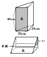 次の図のような,底面が直角二等辺三角形の三角柱の容器があり,水を入れます。そして,水を入れた後に,「あ」が底面になるようにこの容器をたおします。