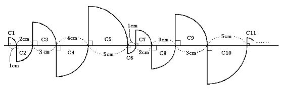 下の図のように,直線に沿って半径1cm,2cm,3cm,4cm,5cmの円の一部(おうぎ形)を左から規則正しく並べ,順にC1,C2,C3,……とします。