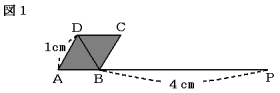 次の図1の四角形ABCDは,一辺が1cmの正三角形を2つ合わせたひし形です。このひし形の頂点Bに長さ4cmの糸BPが結び付けてあり,はじめ3点A,B,Pはこの順に一直線上に並んでいます。円周率を3として,次の各問いに答えなさい。