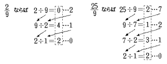 太郎君は分数について,次の例に示す方法で余りが0になるまで割り算をしました。